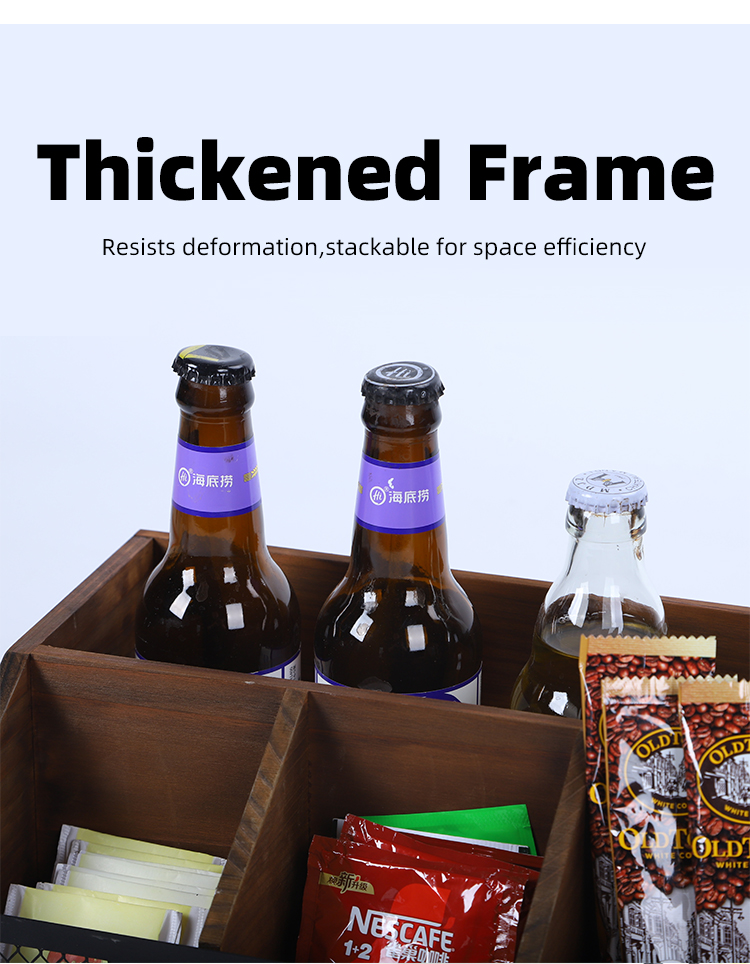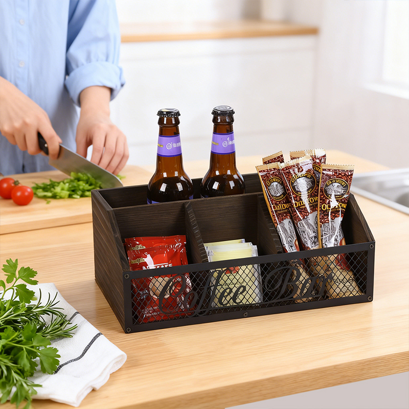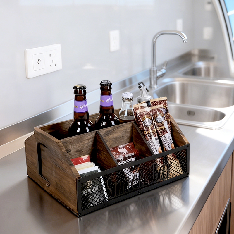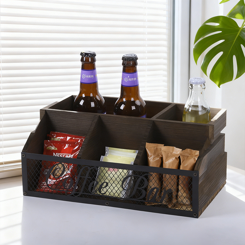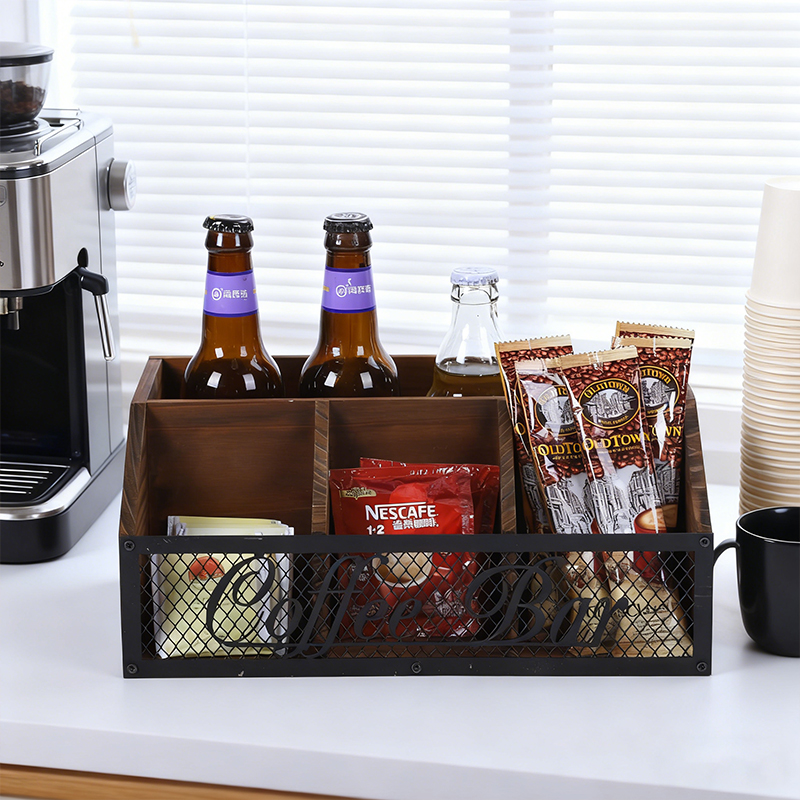 Retro wooden metal mesh coffee bar storage box, desktop multi-compartment classified storage box, wine and snack organization box